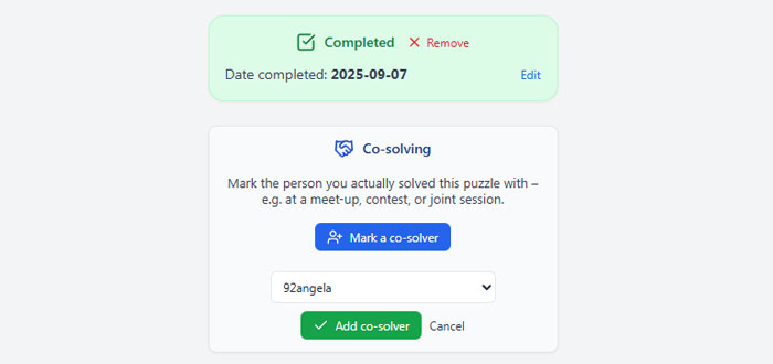 On a puzzle page, if you mark it as completed, you’ll now see an extra option to tag your co-solvers — the people you actually put that puzzle together with (puzzle meetup, contest, a cozy evening, etc.). You can even add multiple people.