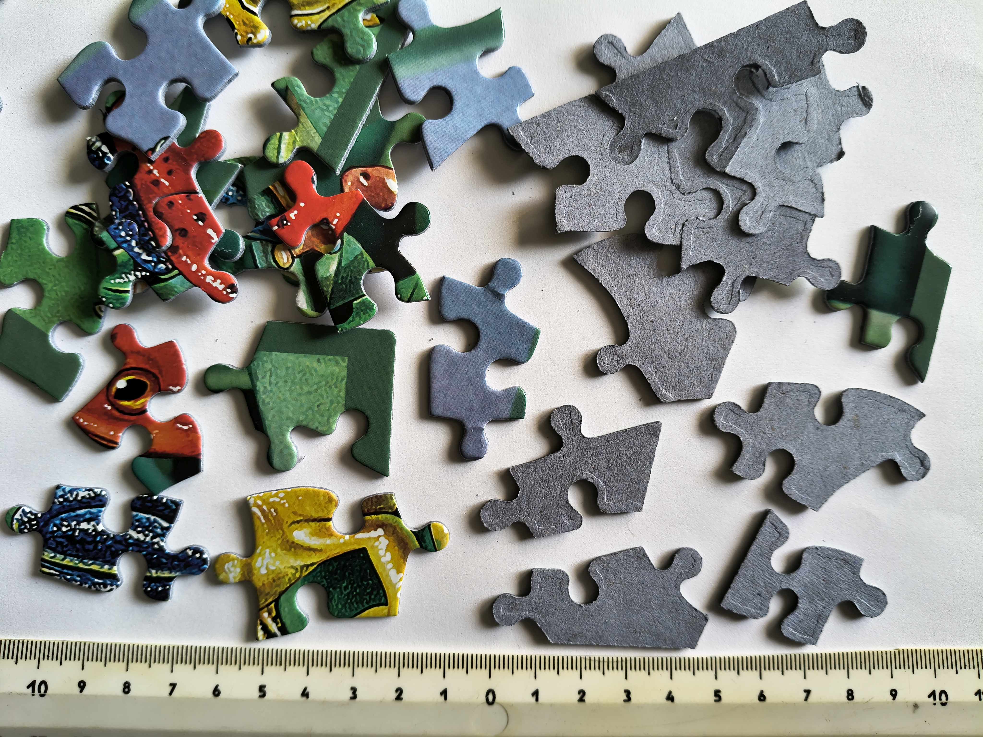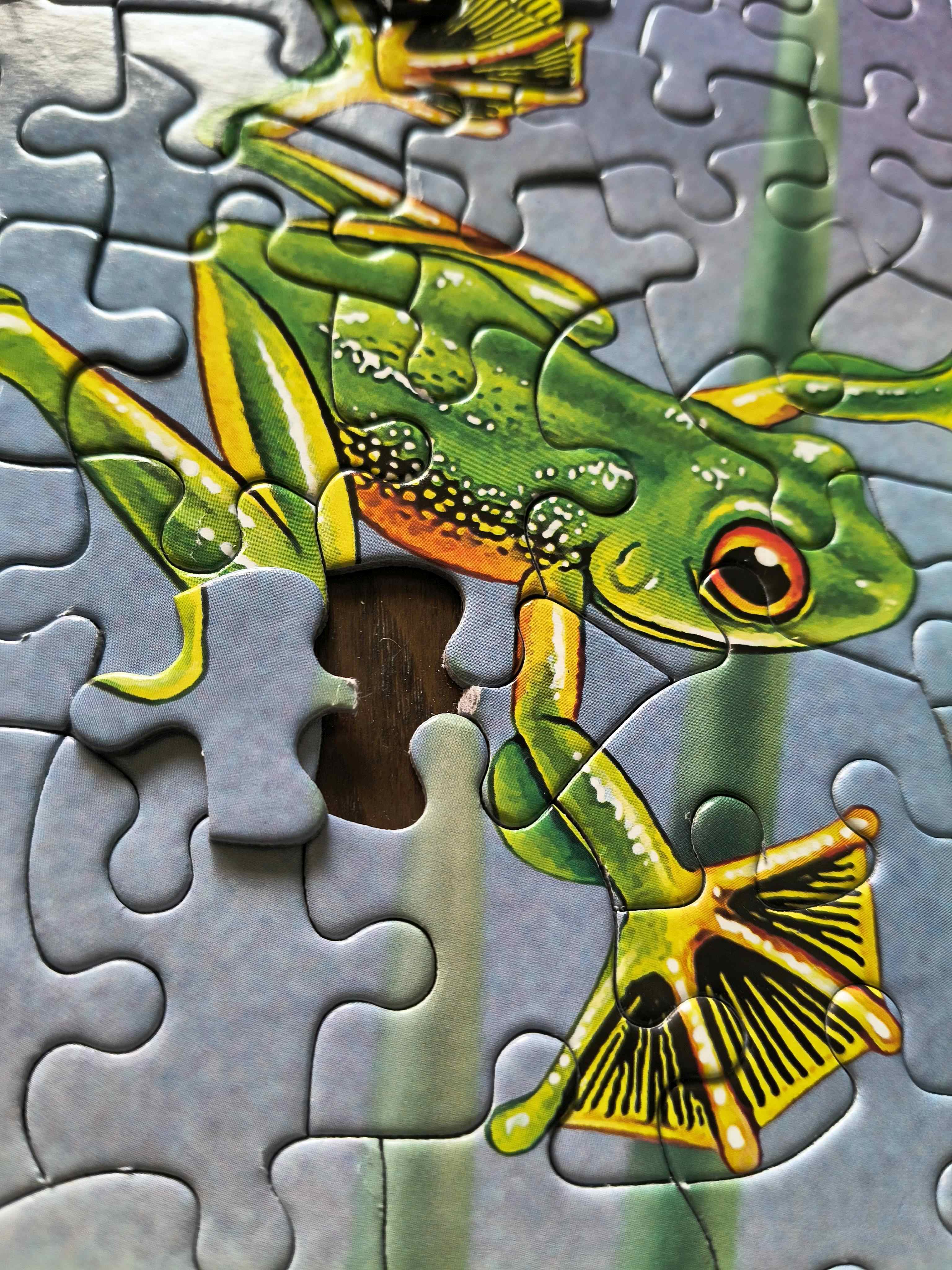 Urocze żabki zachęcają do układania, chociaż nie lubię takich udziwnionych kształtów dobrze się bawiłam - ciekawy temat i ładne kolory rekompensują trochę wady tych puzzli - a to głównie kształty - miejscami elementy są tak cienkie. że nie mają prawa przetrwać :(